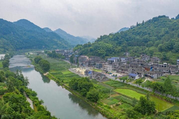 这座房屋建在山里的河边,正是河流的反弓背上。