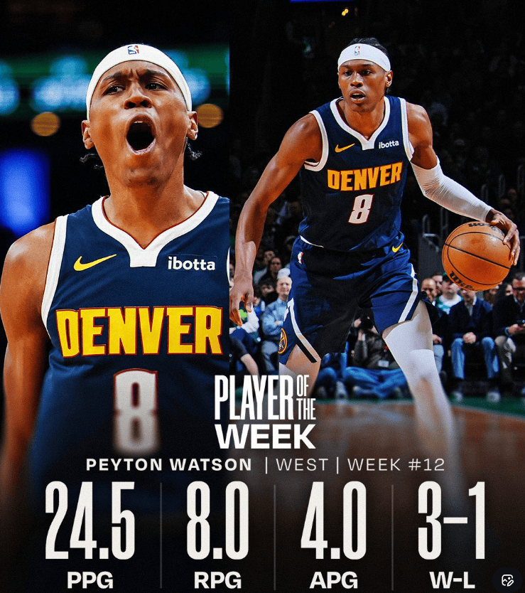 虎扑01月13日讯 今日,NBA官方公布了2025~26赛季第12周1月5日至11日(美国当地时间)NBA的西部和东部周最佳球员,其中掘金球员佩顿-沃特森当选西部周最佳。
